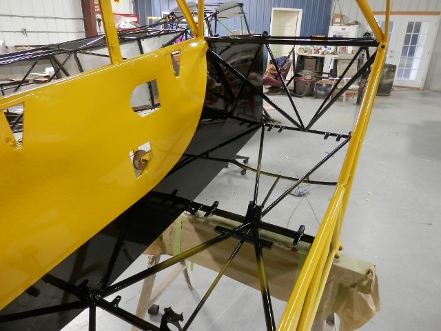 J-3 undergoing restoration. Fuselage freshly painted after repairs. |